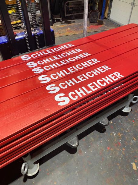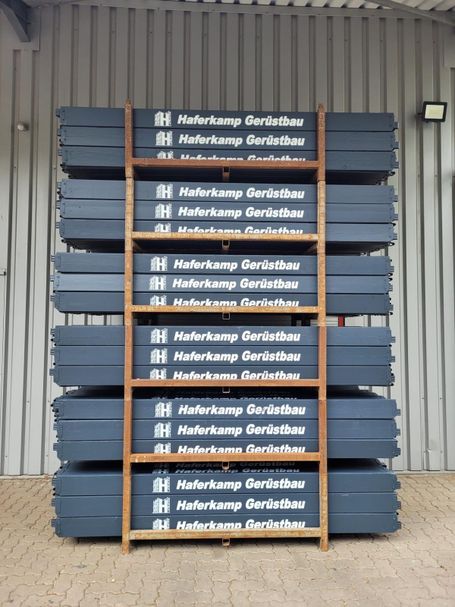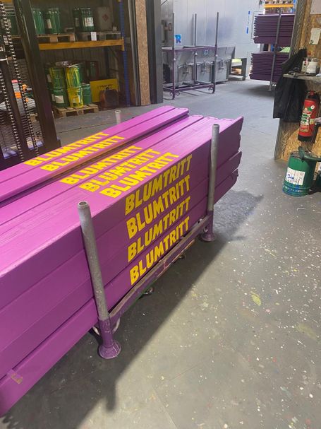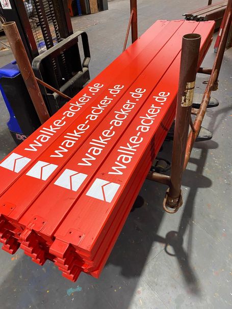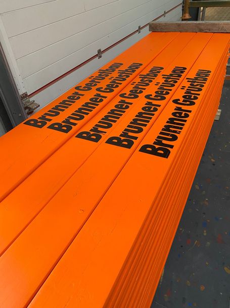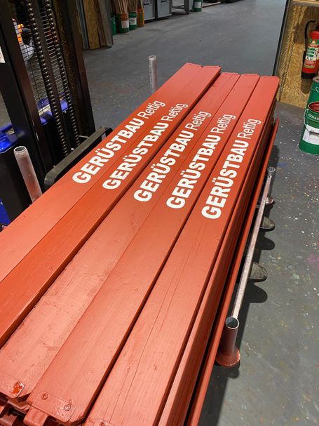 Anschließend erhalten die Bordbretter einen zweifachen Farbanstrich im gewünschten RAL-Farbton. Im Siebdruckverfahren wird danach die gewünschte Beschriftung präzise aufgebracht und schon sind die Bordbretter bereit für ihren Einsatz im Gerüst. Ein Ergebnis, das sich sehen lassen kann!